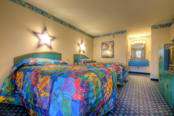 Other features of Disney's All-Star Movies Resort include a theater-inspired food court with five tasty concession outlets, pizza delivery room service and Silver Screen Spirits – a pool bar serving up sandwiches and snacks. Continental breakfast is served daily by the pool. As for guest rooms, each features either two double beds or one king-sized bed, a vanity area with sink and a separate bathroom. And, all this comes at a budget-friendly price Disney fans are sure to love.
